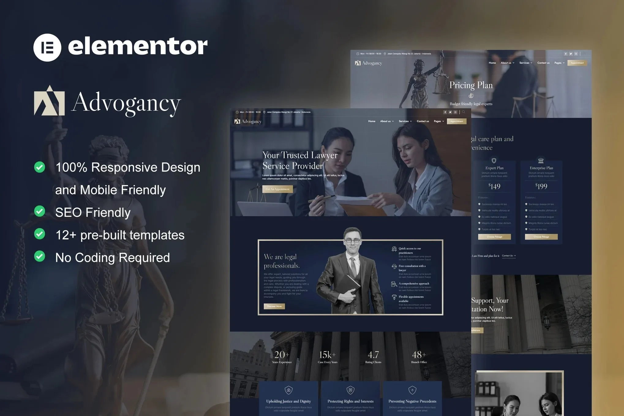 Advogancy is an Elementor Pro Template Kit for Attorney & Law Firm website. It has 12+ pre-built templates with clean design and modern style, suitable for any business or services related to law and legal services website such as attorney website, law firm, legal service, lawyer service, advocate, legal advicer, etc.