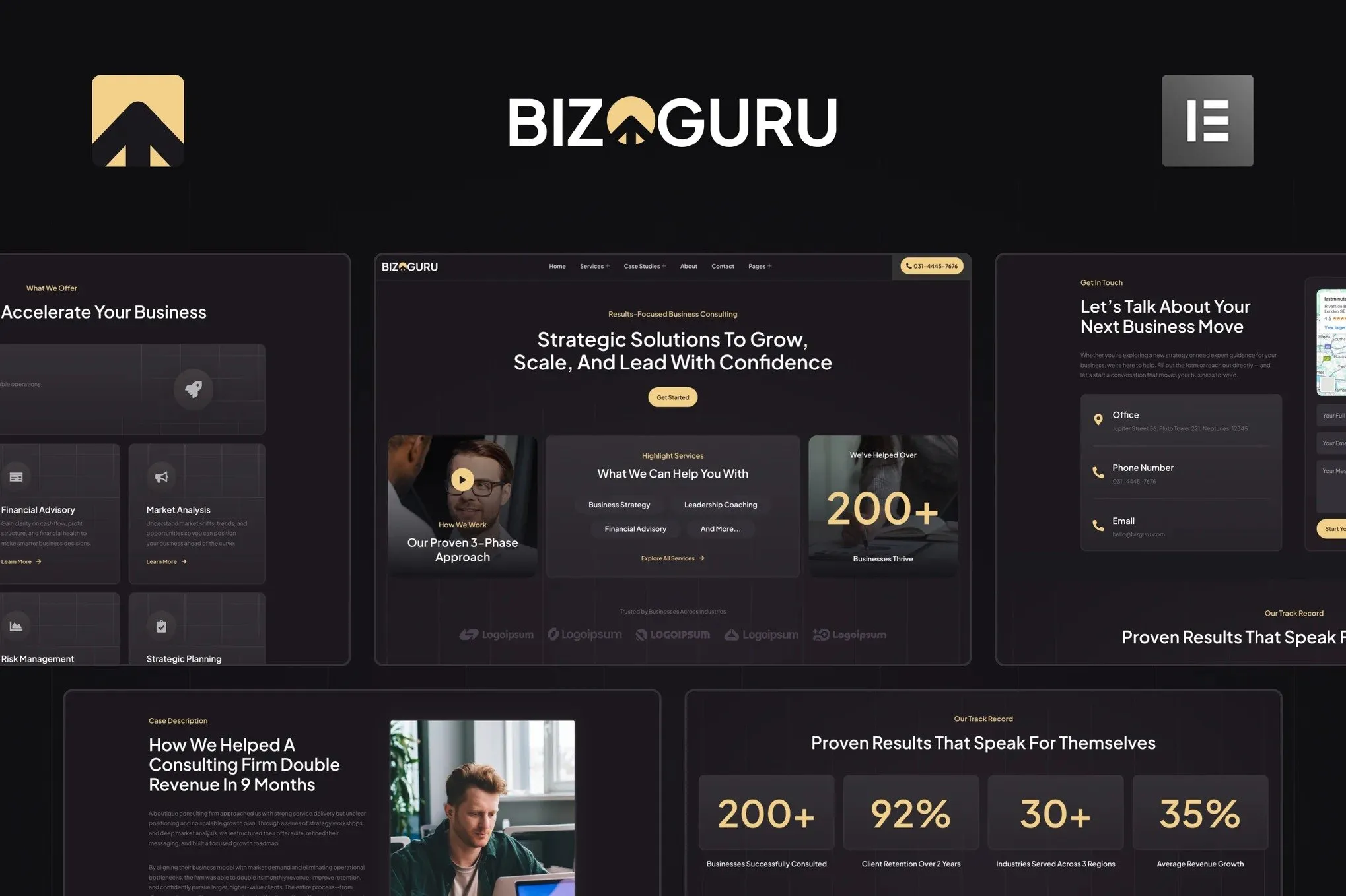 Biz Guru is ideal for individual consultants, small agencies, and established firms looking to refresh or launch their online presence. It works particularly well for professionals who need to showcase a portfolio of services, highlight successful client engagements through case studies, and provide clear ways for potential clients to get in touch. Whether you are an executive coach establishing your brand, a financial advisor detailing your investment strategies, or a strategic consultant presenting your methodology, this kit provides the structure you need.